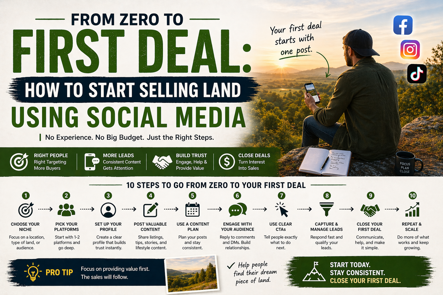 Learn how to start selling land using social media from scratch. A step-by-step guide to building an audience, generating leads, and closing your first deal.